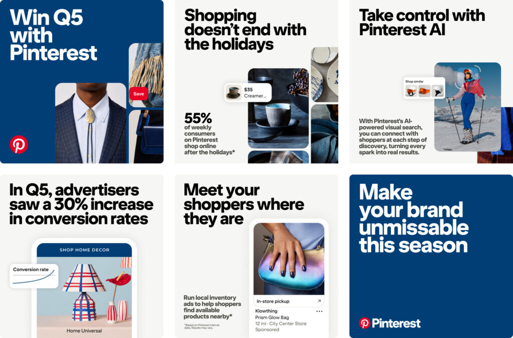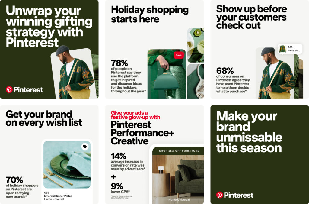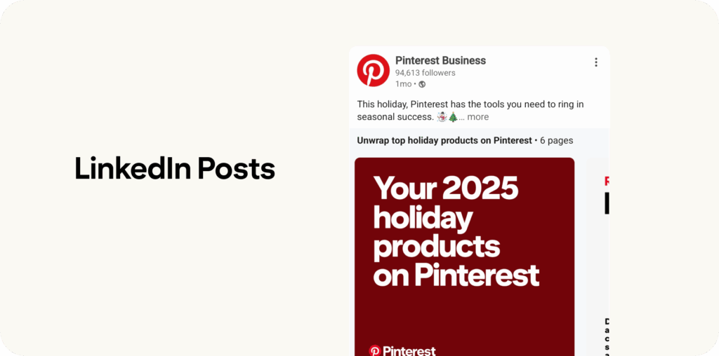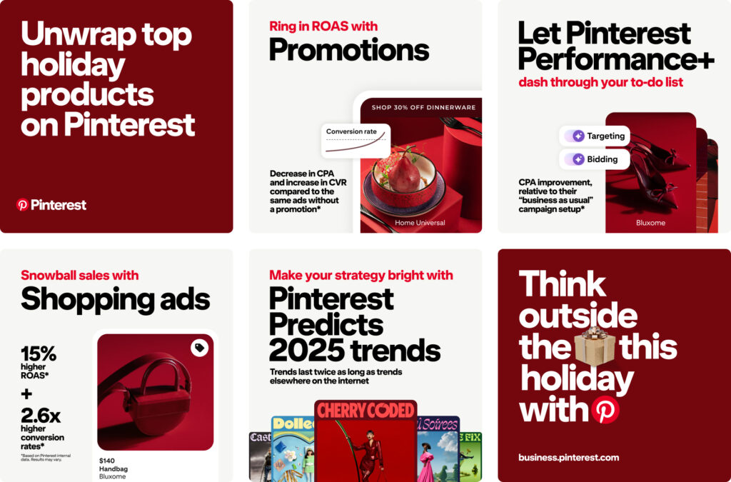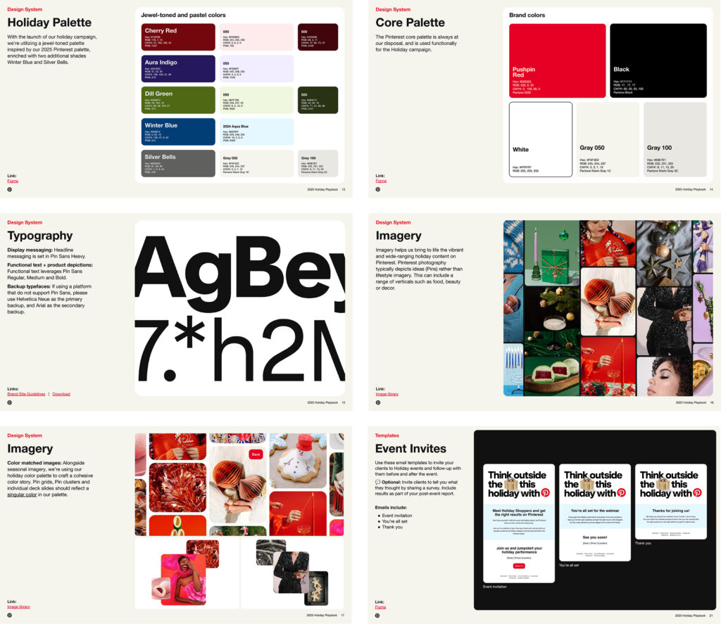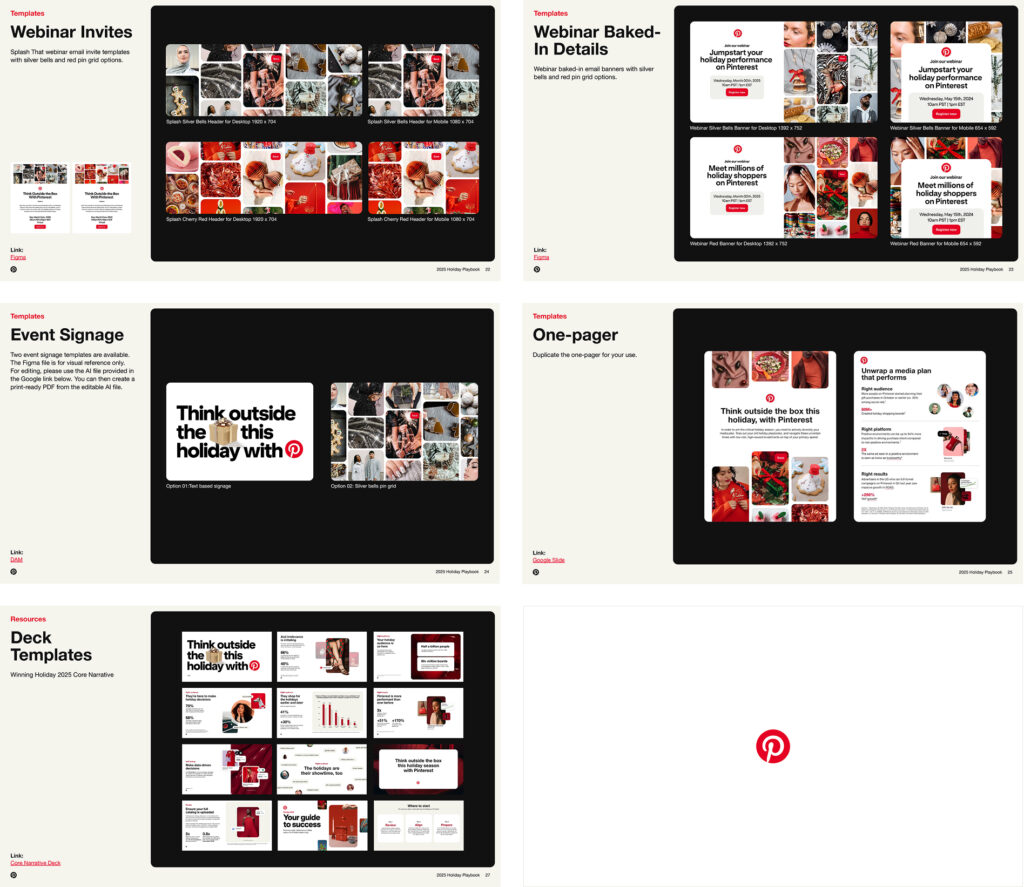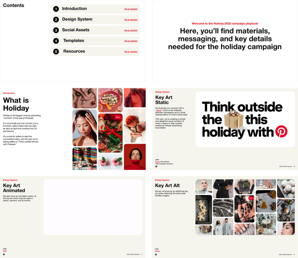 Brought Pinterest’s Holiday Playbook to life through vibrant layouts spanning print, social, webinars, and emails—guiding internal teams in creating cohesive B2B holiday materials. Designed social posts that carried the same festive, unified look.